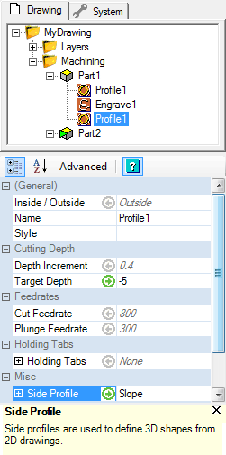 Two tabs are available above the tree view, at the left side of the CamBam window: Drawing and System.