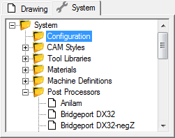 The System Tab shows another tree view, this time displaying objects and settings available to all CamBam drawings, and contains the following sub folders: