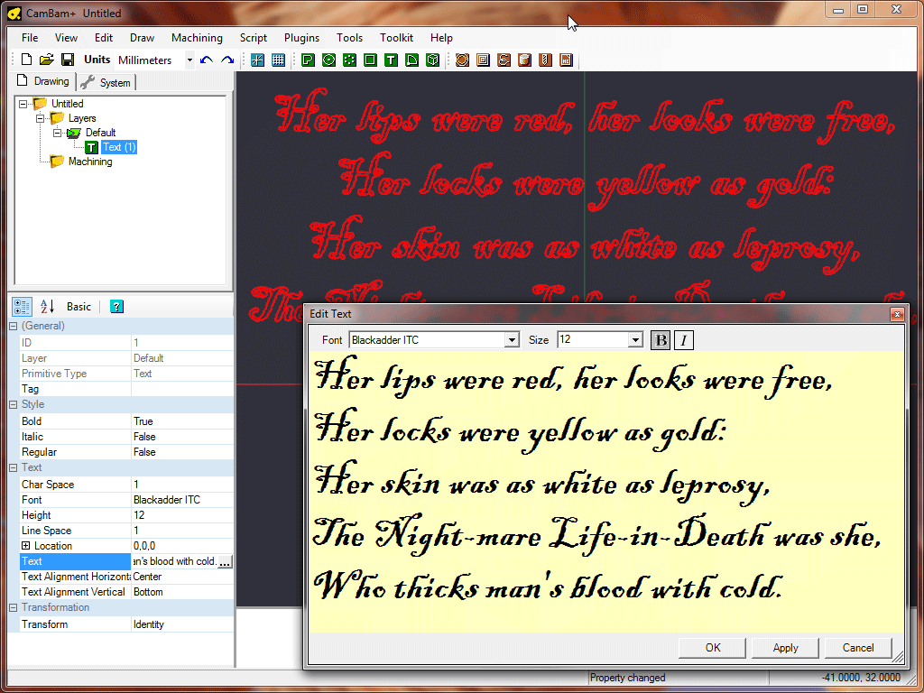Text can be modified at a later stage by double clicking the text object in the drawing tree, or by clicking the ellipsis […] button to the right of the Text object’s Text property.