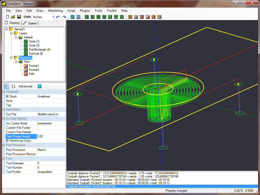 The basic work flow for generating CAM files in CamBam is to first draw or load in drawing objects, then insert machining