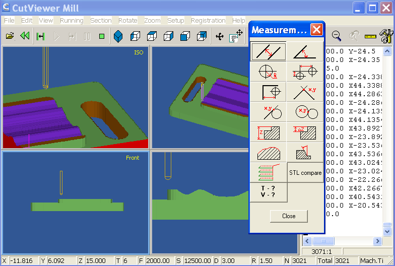 Starts the third-party software CutViewer Mill, to provide a 3D machining simulation from the Gcode file produced. To avoid having to provide CutViewer parameters manually, you must use a post processor designed to work with this software. (E.g. Mach3-CV for milling, Mach3-Turn-CV for turning). You must also define a stock object in the machining or Part objects.