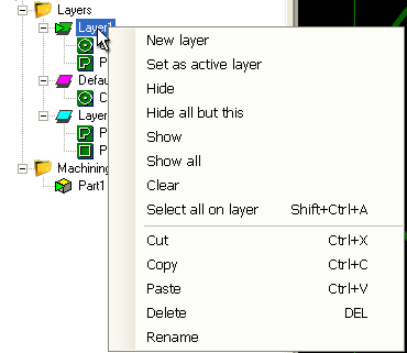 drawing tree by a small green arrow icon. The active layer is set by right clicking a layer in the drawing tree, then